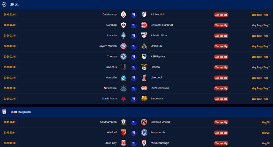 • Hiển thị theo ngày, giờ và giải đấu: người hâm mộ dễ dàng thấy trận nào diễn ra trong ngày hôm nay, tuần này, hoặc sắp tới.